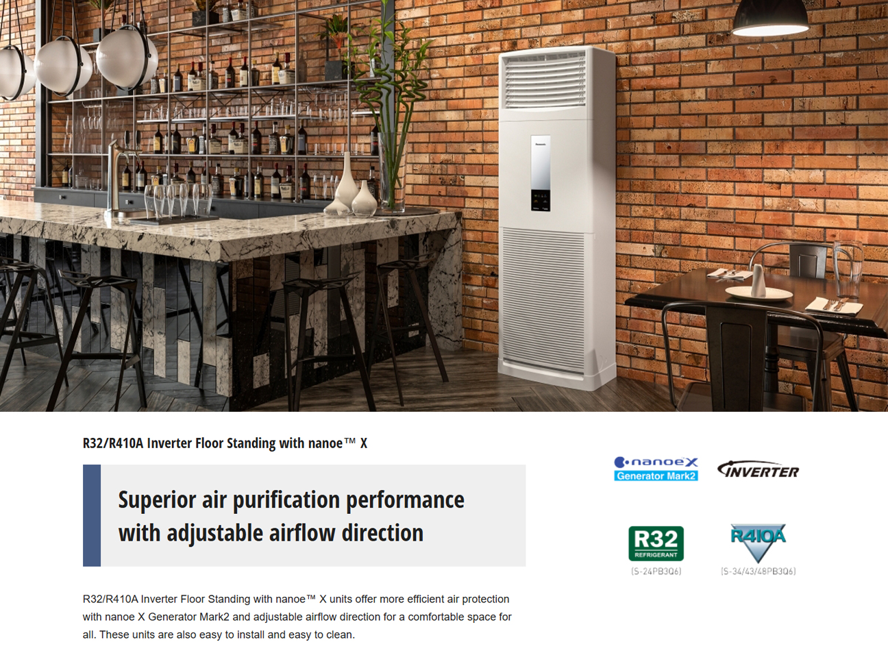 Panasonic Floor Mounted Inverter Aircon offers energy-efficient cooling with advanced nanoe™ X air purification. Ideal for large spaces, it features a sleek design and long-range airflow for all-around comfort