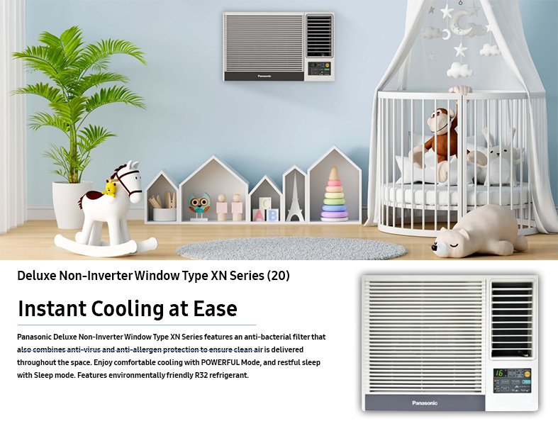 The Panasonic Deluxe Non-Inverter Window-Type Air Conditioner offers powerful cooling with an anti-bacterial filter, eco-friendly R32 refrigerant, and modes for fast cooling and comfort, perfect for various room sizes